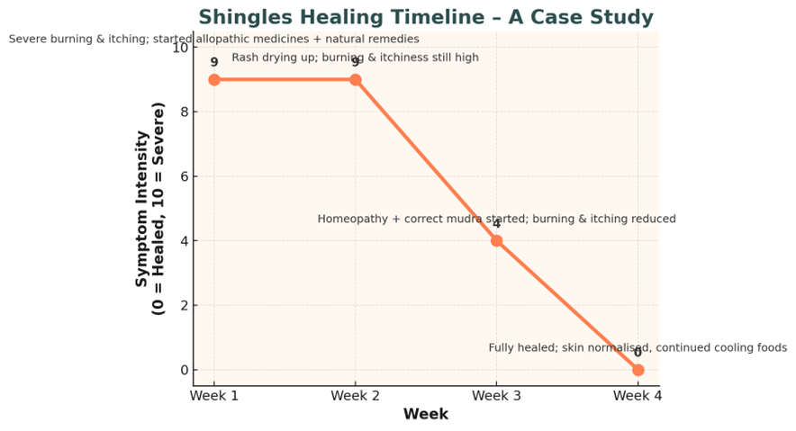 • Week 3: Pain dropped to 4/10 – Homeopathy + correct mudra started; major reduction in burning & itching.
